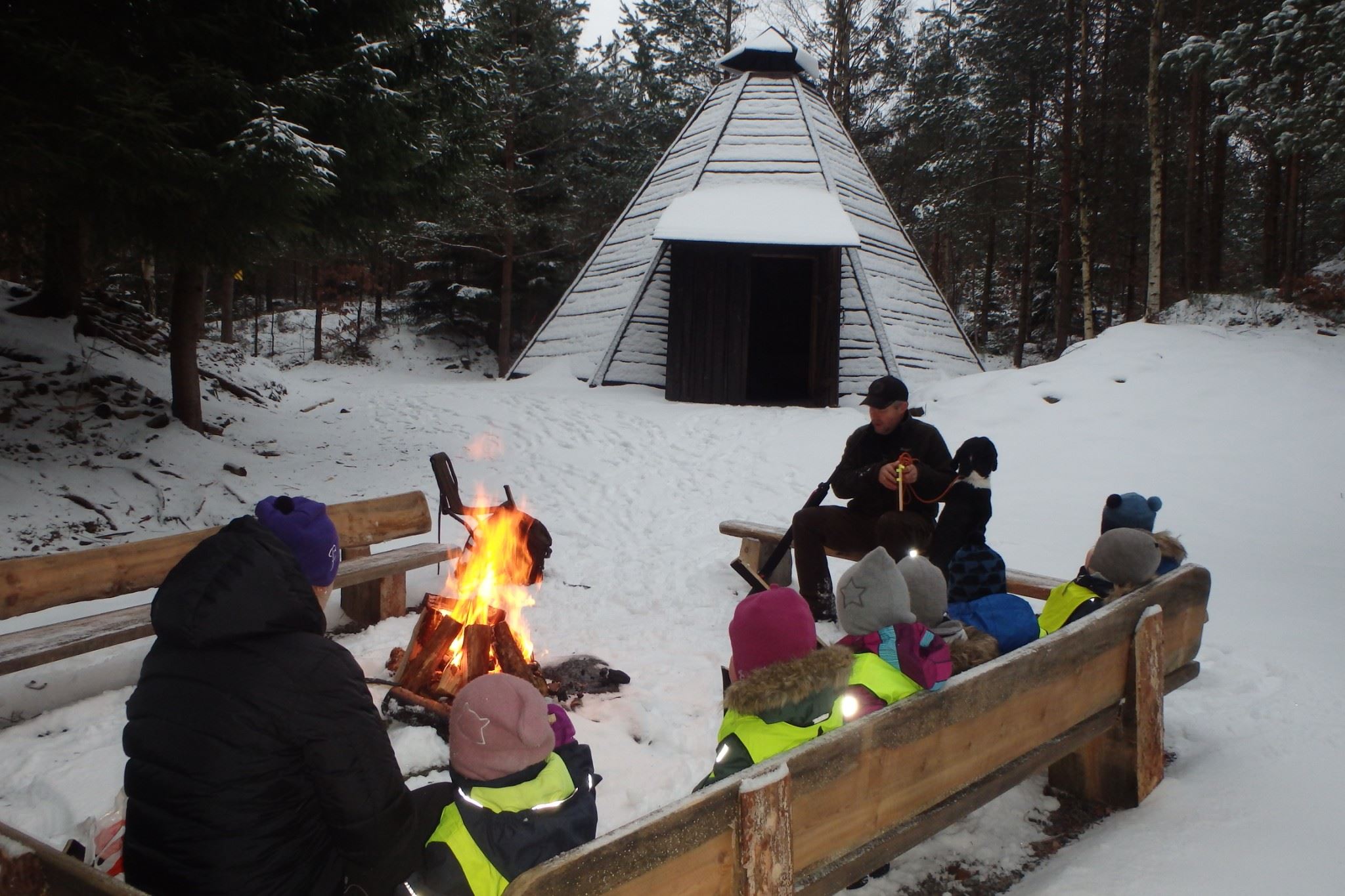 Vår nærmeste nabo er skogen som vi bruker flittig gjennom hele året. Vi tilbereder ofte middagen over bålet i barnehagens flotte lavvo som ligger i skogen rett ved barnehagen